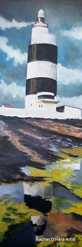 with its mirrored image broken in the seaweed strewn shallow rock pools, by contrast my second painting “Rising tide at Hook” depicts the might of the sea, with the ebb and flow & the swell of the water. The whitewash of the Lighthouse is transformed into gold from the setting evening Sun.